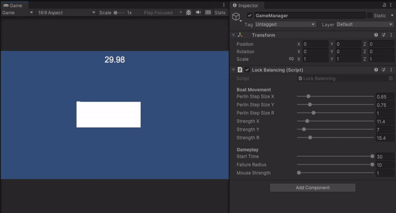 I started work on the first minigame Lock Balance, or at the time called "Canal Balance", I made the boat be pushed around using one-dimensional perlin noise, one for each axis and another for rotation, as it was some smooth randomness that was easily controllable for the designers to play with. Originally the game was played from a top-down view but due to perception issues during a demonstration in class of the progress this was quickly changed to a side-on view instead.