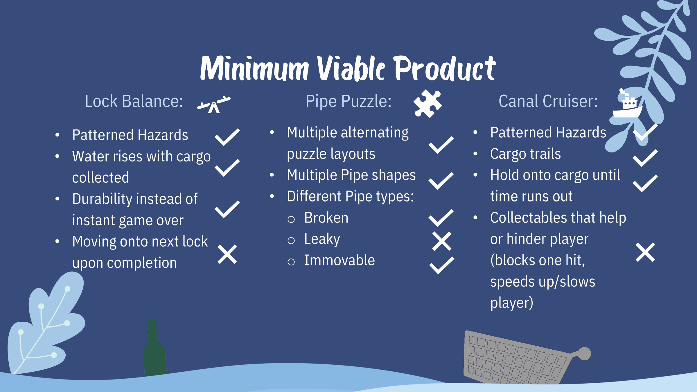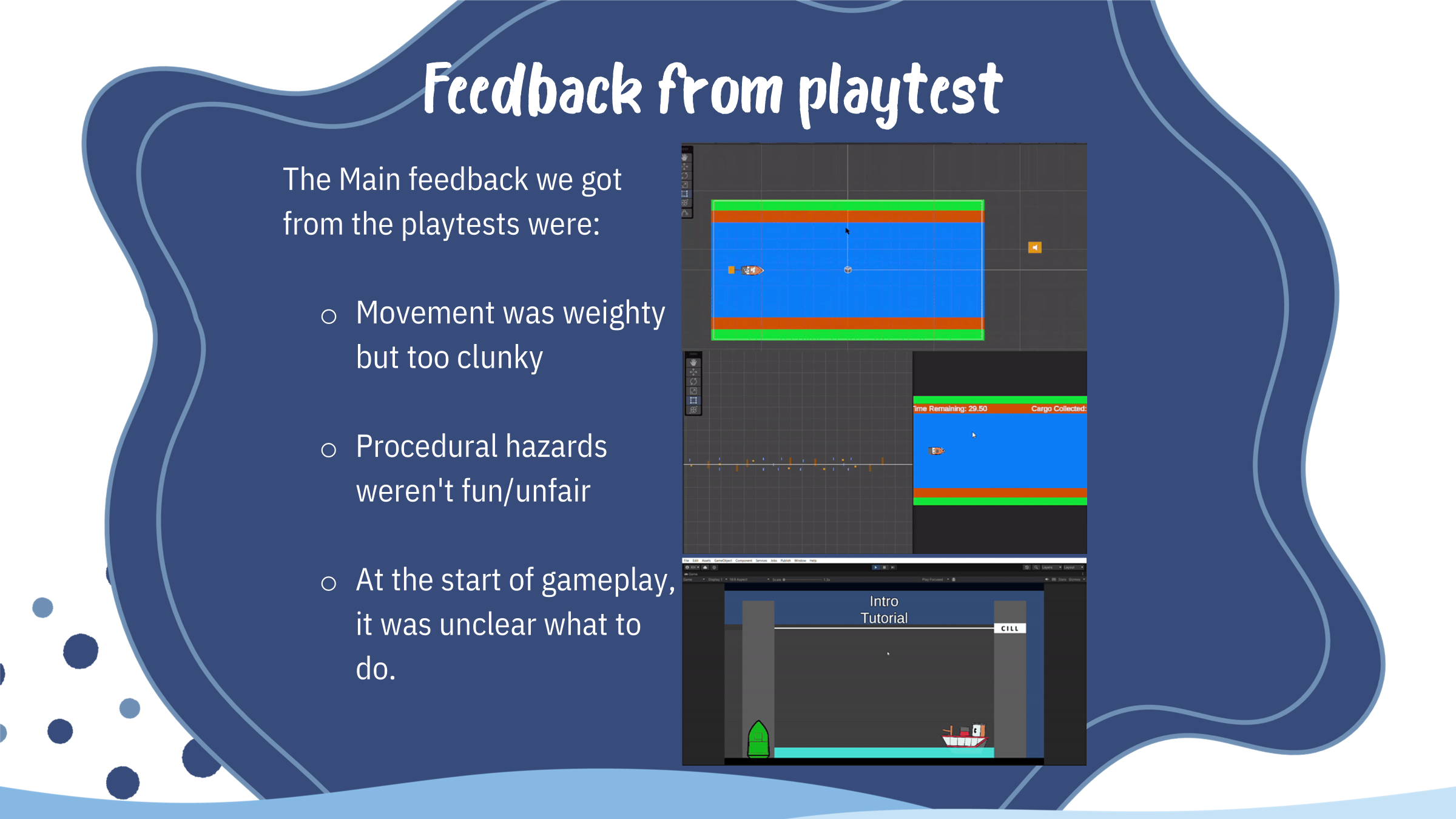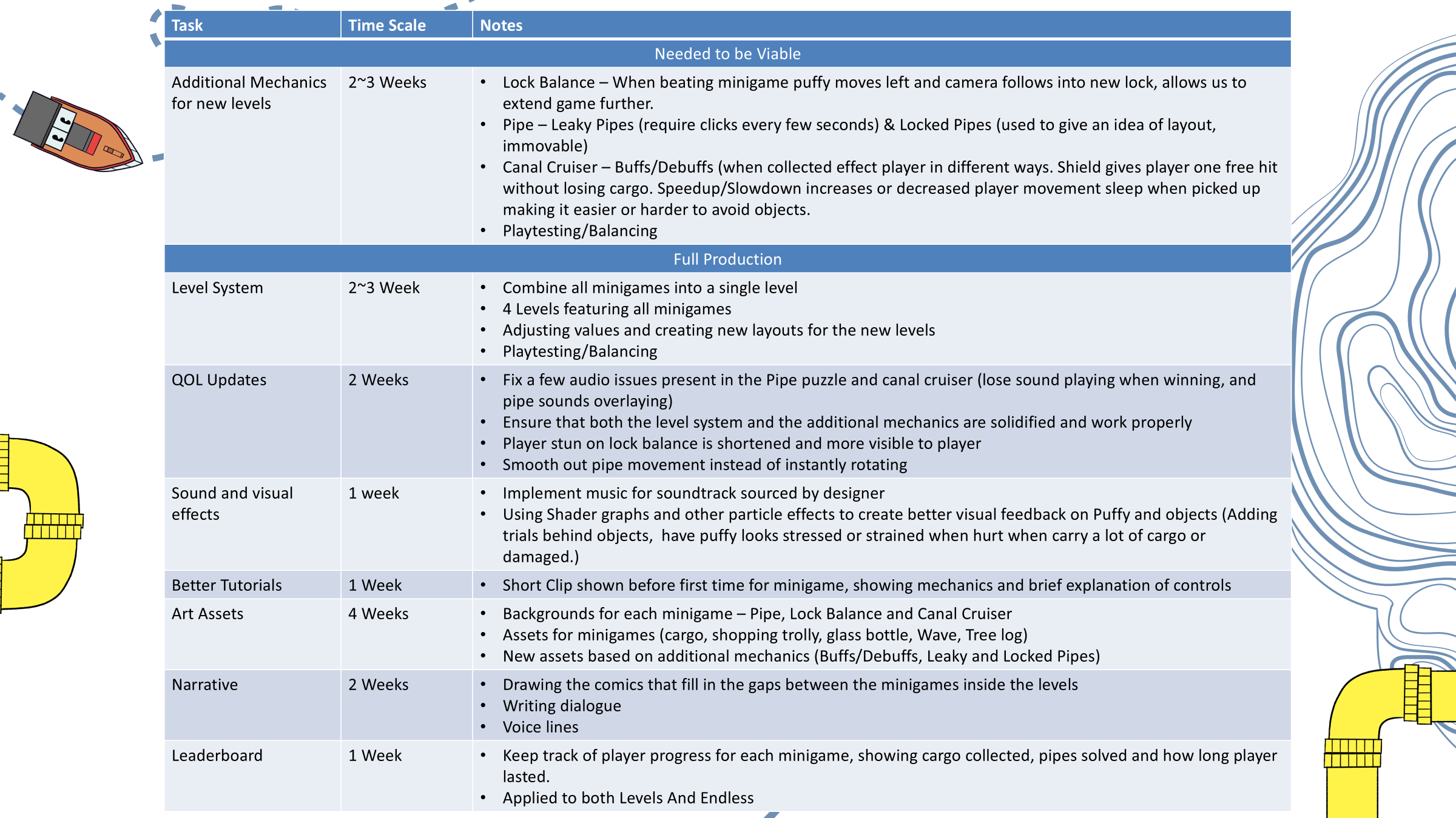 After the presentation we focused on acting upon the feedback we got, I mostly focused on Canal Cruiser due to it lagging behind slightly compared to the other games. I changed the movement from lane-based to be completely free by borrowing my movement function from Lock Balance, rotated the playfield to make the obstacles from top to bottom to instead be right to left, added mouse controls to steer Puffy for mobile support for parity with our other minigames and for bonus accessibility, changed the win condition to be collecting creates based instead of surviving for a period of time and made the cargo dynamically add and remove itself behind Puffy when the player do collects them or get hurt by a obstacle instead of constantly having 3 as a quasi-life metre, changed the rope from being based on hinges to distance joints which finally got rid of the cargo stretching issue that was plaguing any showcase after playing for a short while, make Puffy flash when damaged, and made the game overall a lot faster.