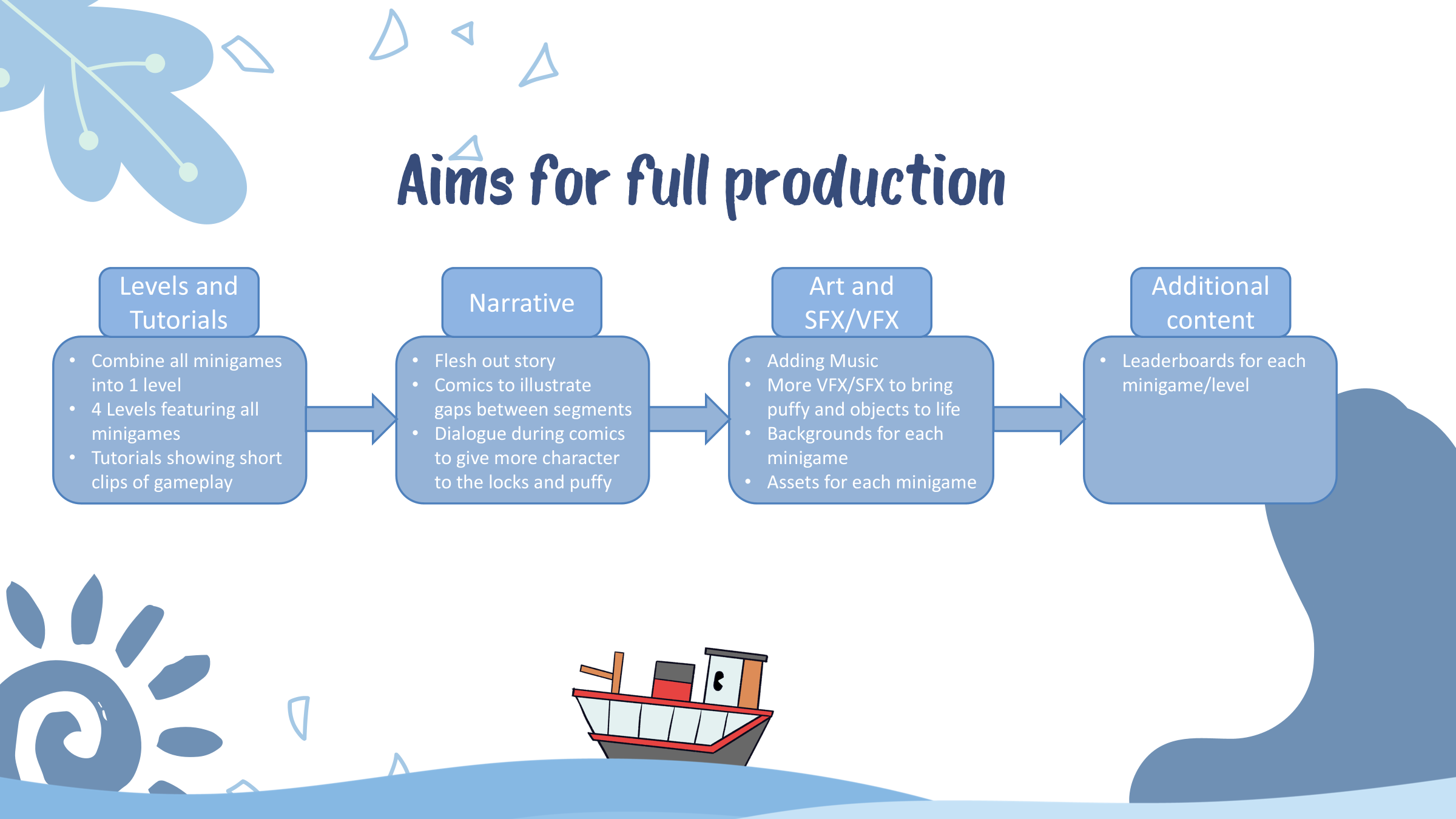 The real highlight of this year. Puffy MacPuffer is an opera about the titular character Puffy, a puffer boat and their adventure through the five Crabbit Canals. The development was split between two phases; Preproduction, no points for guessing what that was about, and the main meat of IP3 where we developed the game.